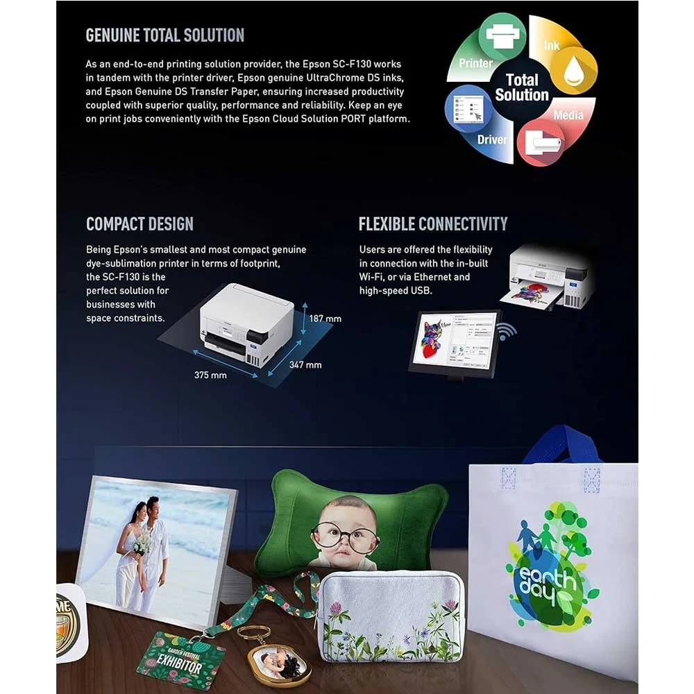 The printer is perfect for producing small and bespoke products such as cushion covers, bags, mugs, and even aluminium photo frames without additional fuss, Epsons smallest A4 Dye Sublimation Printer, CISS ink tank with CYMK ink , Designed for Dye Sublimation on both rigid and textile bespoke products, High durability and reliability.